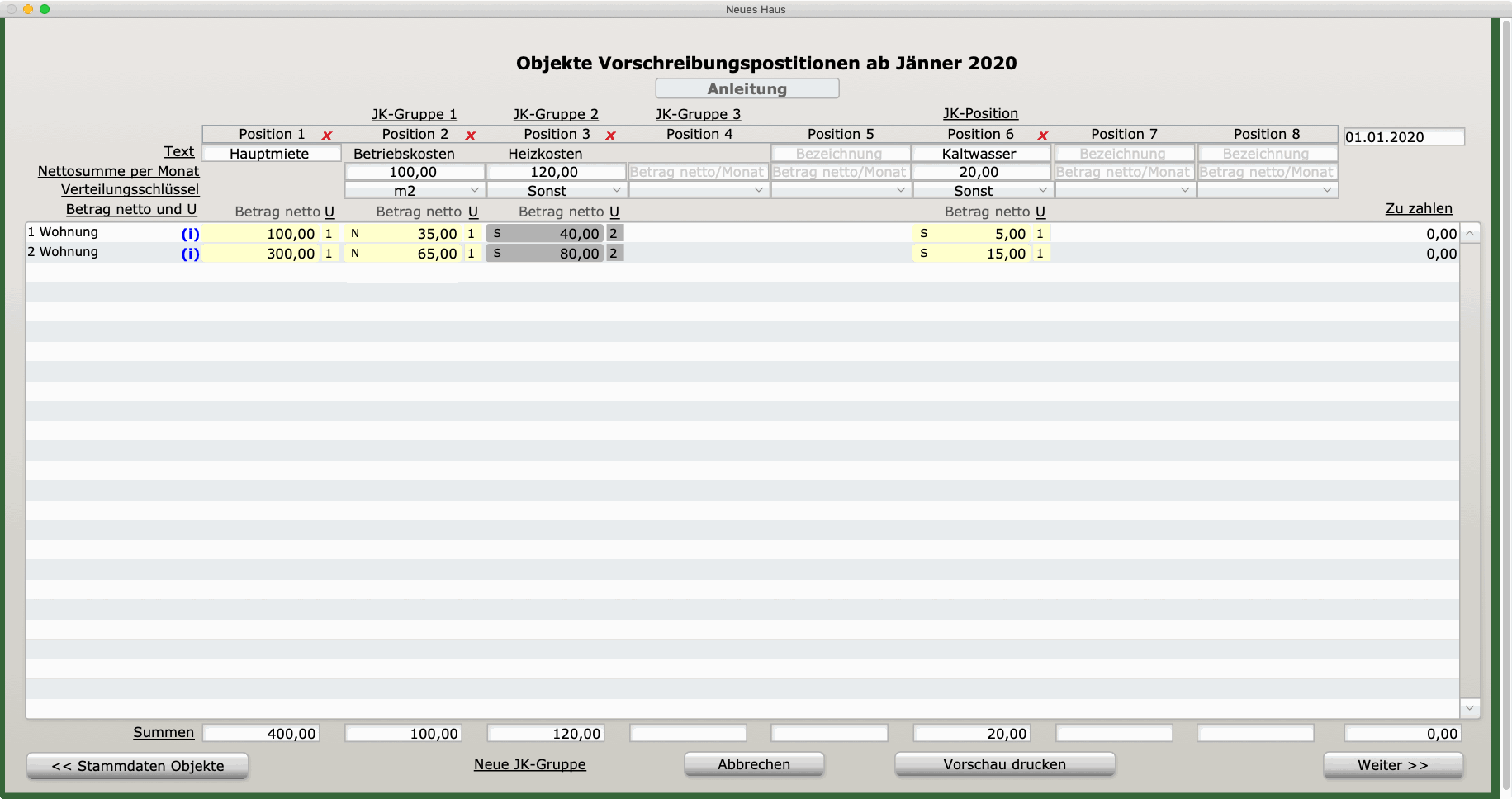 Neues Haus: Geben Sie die Daten wie im Beispiel ein (nach Anlage des Hauses und der generellen Objektdaten). Klicken Sie oberhalb von Pos. 6 auf JK-Position, um das Ausgabenbuchungskonto für diese JK-Abrechnungsposition zu bestimmen oder neu anzulegen.