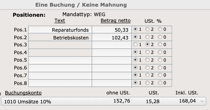 Jede Einnahme wird auf max. 3 Buchungskonten aufgeteilt, je nach USt.-%-Satz (Umsätze 10%, 20% oder 0%). Das macht 1bisX automatisch anhand der in der Vorschreibung (bzw. beim Objekt als Vorlage) enthaltenen USt.-%-Sätze und den dort diesen zugewiesenen Einnahmen/Umsatzbuchungskonten.