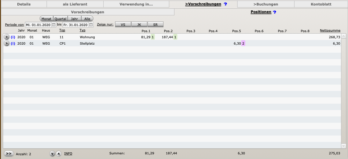 In den Verschreibungen kann man verschiedene Positionen sehen wie Pos.1-8, bei mir ist Pos.1 die Rücklage Pos.2 die BK und Pos.5 ist der Winterdienst für ein Carport