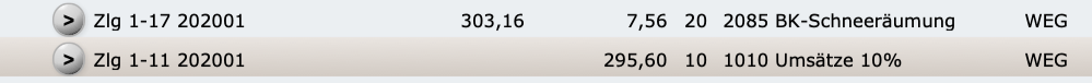 in den Buchungen ist jetzt die Pos.5 dem Konto 2085 BK-Schneeräumung zugeordnet, aber die restliche Monatszahlung ist 1010 Umsätze 10% zugeordnet, aber ich sehe nirgendwo die Zuordnung bei der Zahlung, speziell bei den Sonderrechnungen auf die richtigen Kostenstellen, wie Rücklagenfondzahlungen oder BK-Zahlungen (wie bei mir Pos.1 / 2)